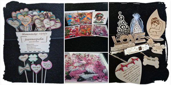 Diamond Painting Karten und Holzarbeiten mit StrassInfos: Handgefertigte Holzkunst mit Strassverzierung - Ich fertige liebevoll gestaltete Dekorationen und Geschenkideen aus Holz – ideal für die Weihnachtszeit. Meine Arbeiten entstehen auf Holzbasis, werden mit dem Laser graviert und anschließend mit funkelnden Strasssteinen veredelt. Zum Sortiment gehören unter anderem Diamond-Painting-Grußkarten, Blumenstecker, Holzanhänger und verschiedene weihnachtliche Motive. Jedes Stück ist ein Unikat, das mit viel Liebe zum Detail entsteht und Glanz in die Adventszeit bringt.