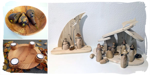 Weihnachtskrippen, Schalen aus heimischen Hölzern, Schreibgeräte, Figuren und vieles mehrInfos: "Holz in Form bringen" - Mit Lust und Liebe gedrechselt, geschliffen und in Form gebracht. Viel Spaß beim Bummel und Einkauf durch die Zehntscheuer und dem Weihnachtmarkt wünschen Euch Marga und Heinz SzameitatKontakt: folgt